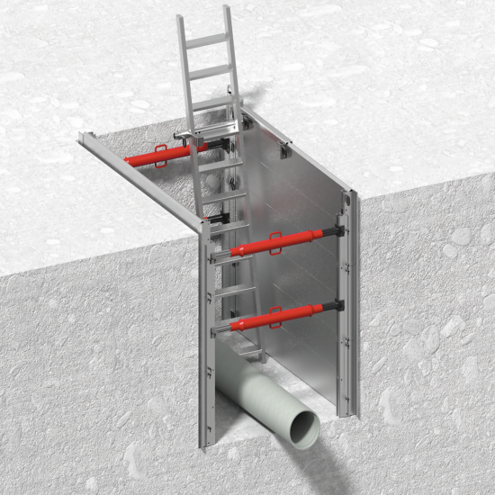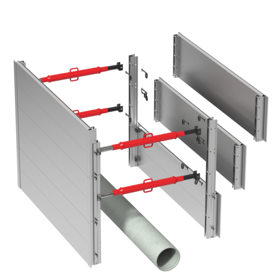 Un caisson de blindage Alu GIGANT est très maniable du fait de sa légèreté ; une minipelle suffit pour la pose. Dans les sols instables, un blindage sur toute la surface est obligatoire ; pour une tranchée de 3 m de profondeur, il est rapidement assemblé et mis en place. Dans un sol stable et pour une profondeur ne dépassant pas 1,75 m, il suffit de poser un caisson de 50 cm en haut de la tranchée (Ce blindage partiel en bordure est autorisé en Allemagne).